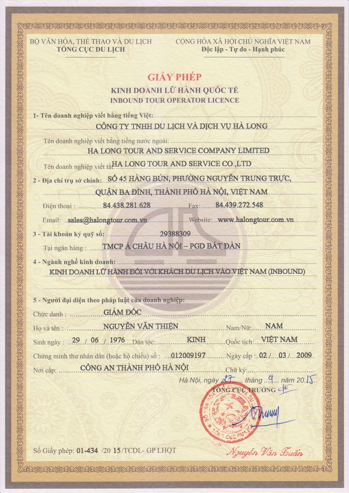 01-434/2015/TCDL-GP LHQT do tổng cục du lịch cấp ngày 27/4/2015. Đây cũng là điều kiện cần và đủ để chúng tôi yên tâm tổ chức cho quý đối tác, khách hàng các chương trình tours chất lượng và có đảm bảo với tài khoản bảo lãnh về chất lượng được quy định trong luật du lịch.
